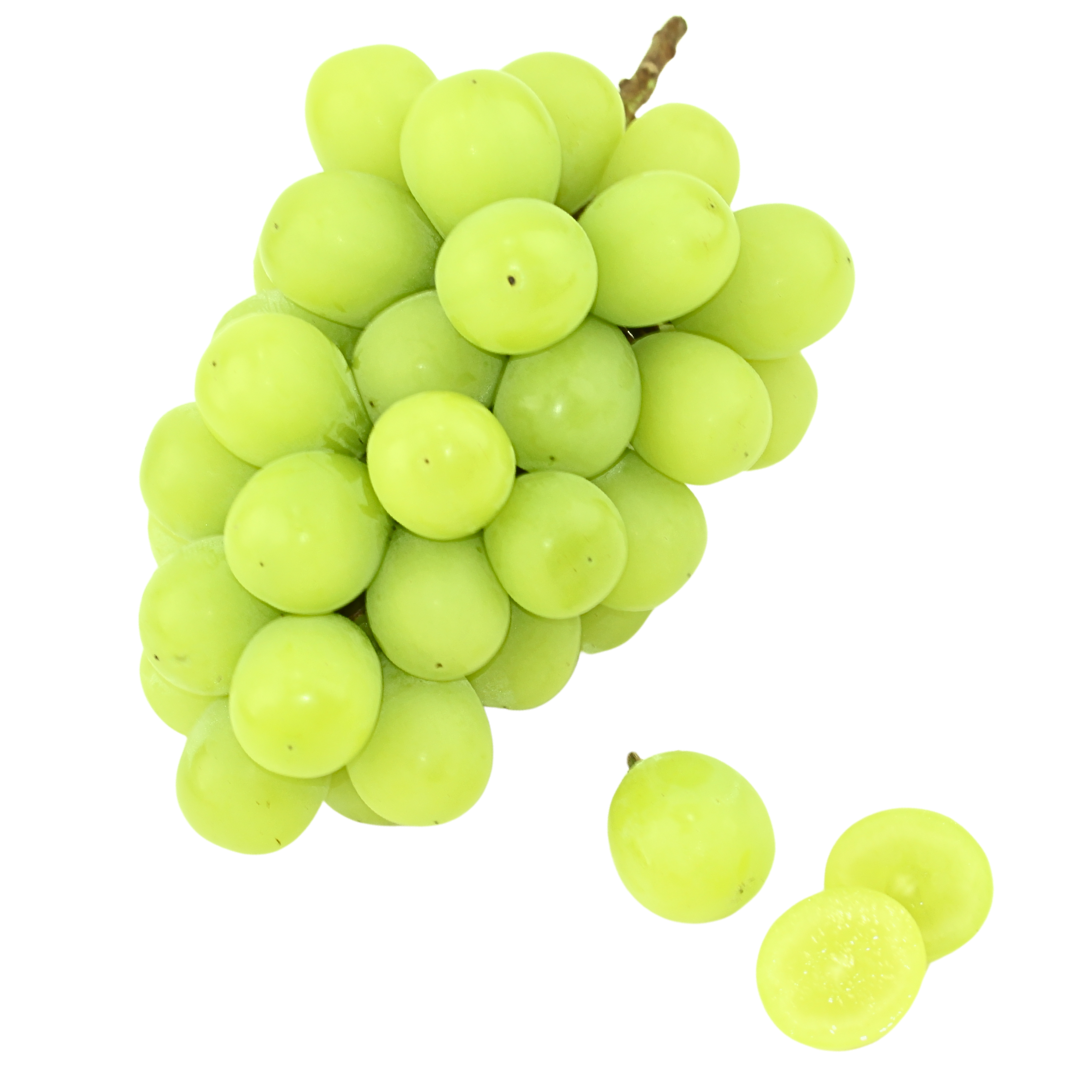 日本で誕生した高級ぶどう「シャインマスカット。」農研機構果樹研究所によって「安芸津21号」と「白南」を交配して育成された品種です。皮ごと食べられる手軽さと、種のない食べやすさが魅力。薄い皮は渋みがなく、パリッと弾ける心地よい食感。酸味が抑えられ、爽やかな香りと上品な甘さが広がります。芳醇なマスカットの香りは、一粒でも贅沢な味わい。