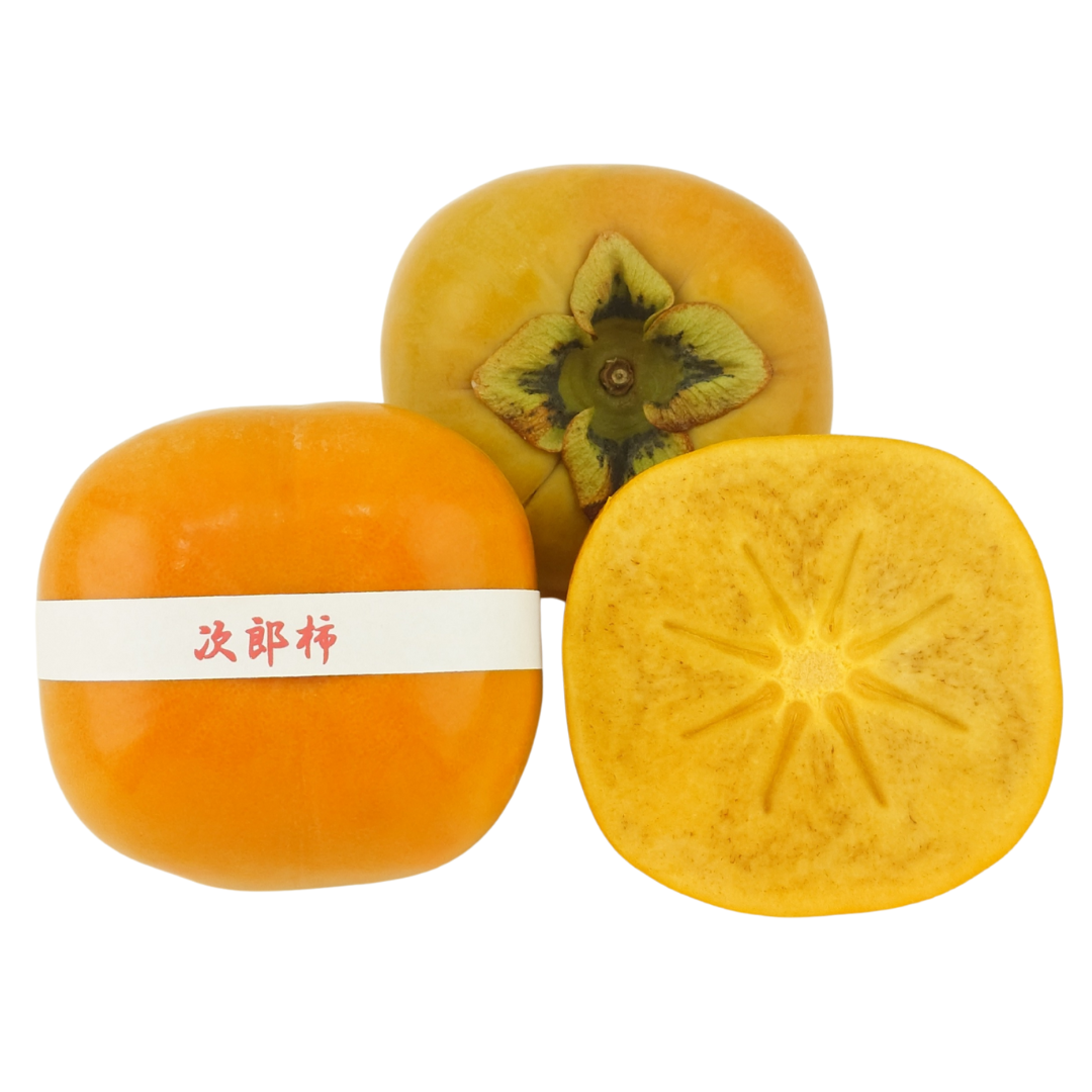 次郎柿(じろうがき)は、完全甘柿の中でもシャキッとした歯ごたえと高い糖度が魅力の人気品種です。見た目は平たい四角形で、ころんとした独特の形が特徴。種がほとんど入らないため食べやすく、噛むたびに感じるカリッとした食感と上品な甘みが、多くの柿好きに支持されています。