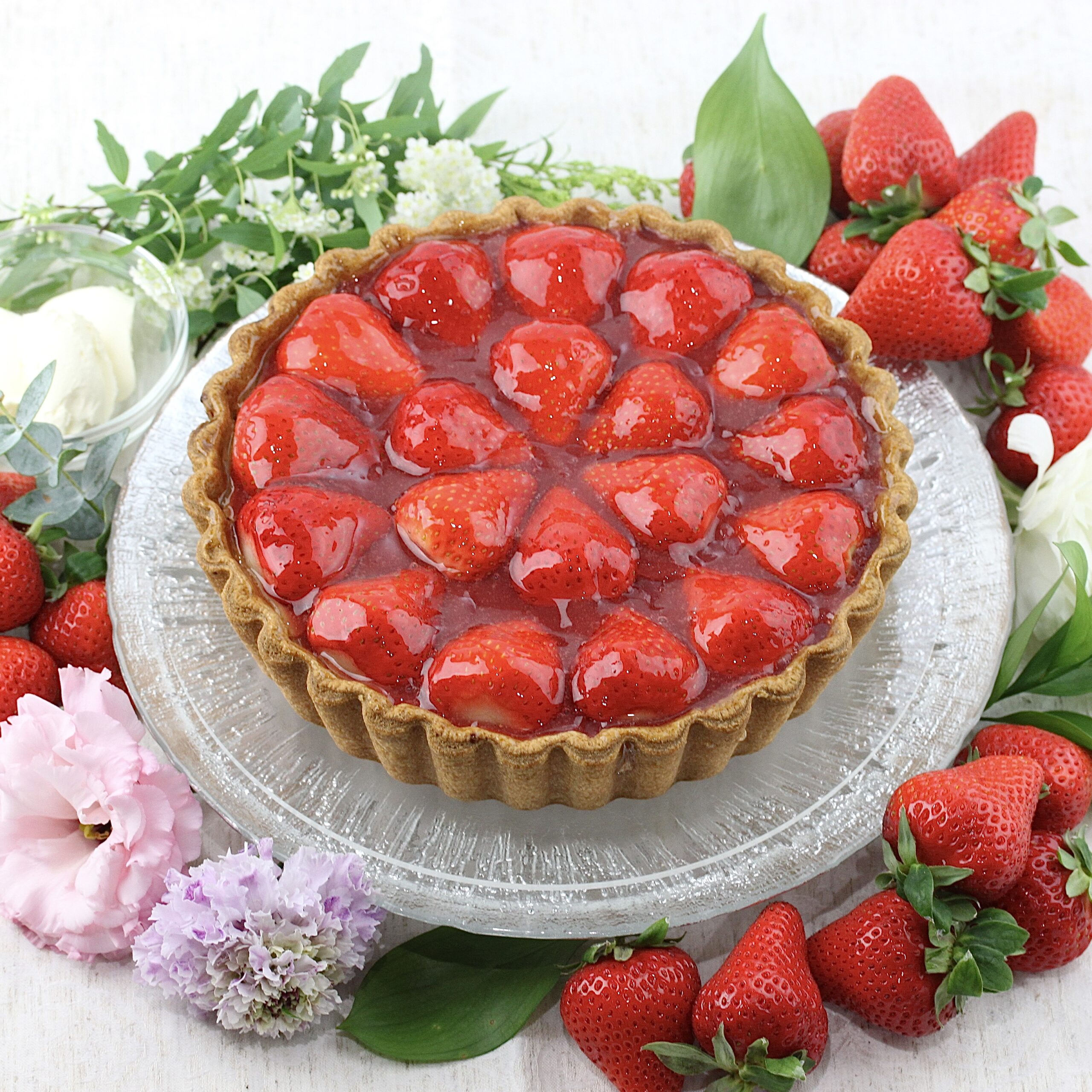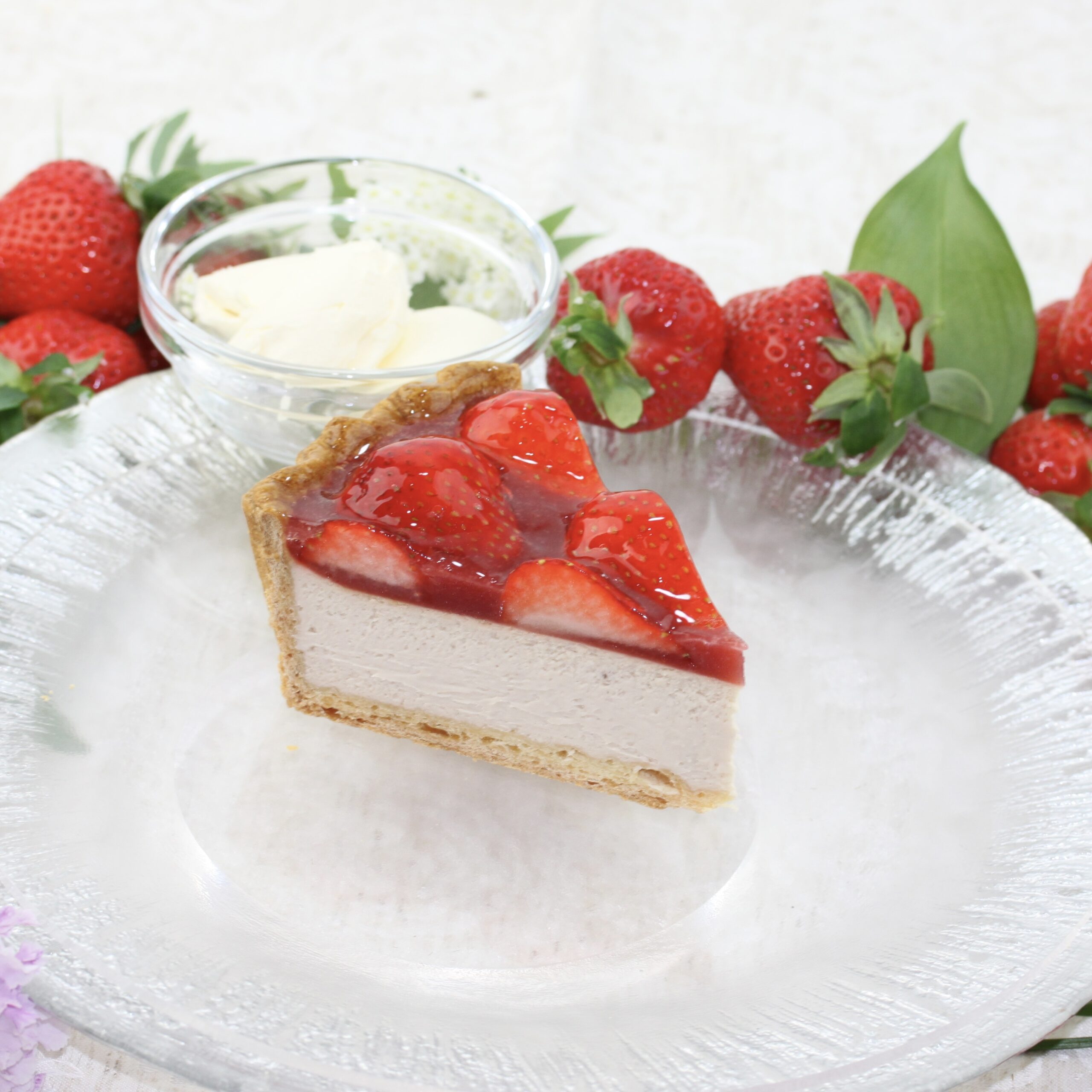 サクサクの甘いクッキー生地に、いちごピューレを混ぜたたっぷりのチーズ生地を焼き込み、仕上げにいちごソースと甘酸っぱい苺を飾り付けました。