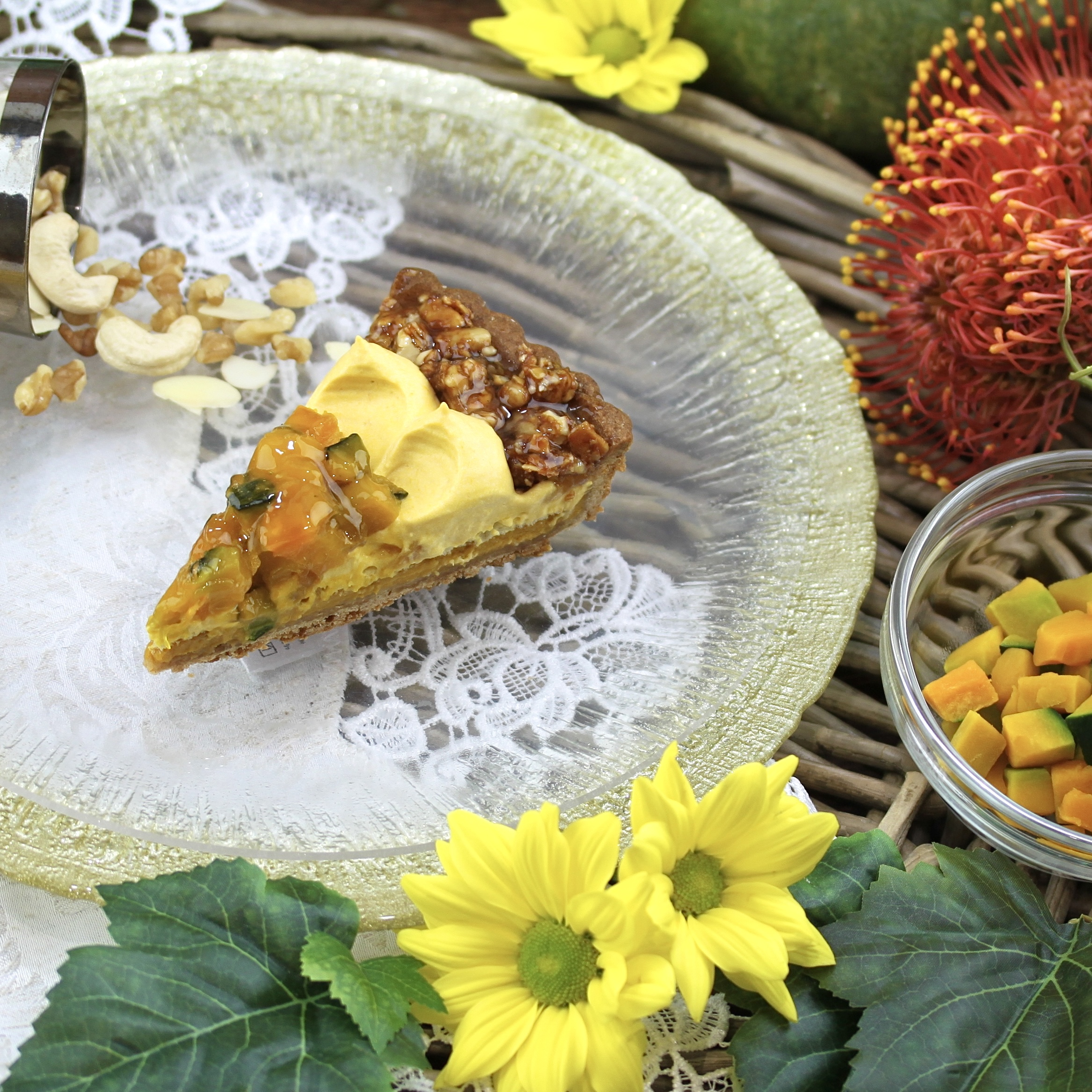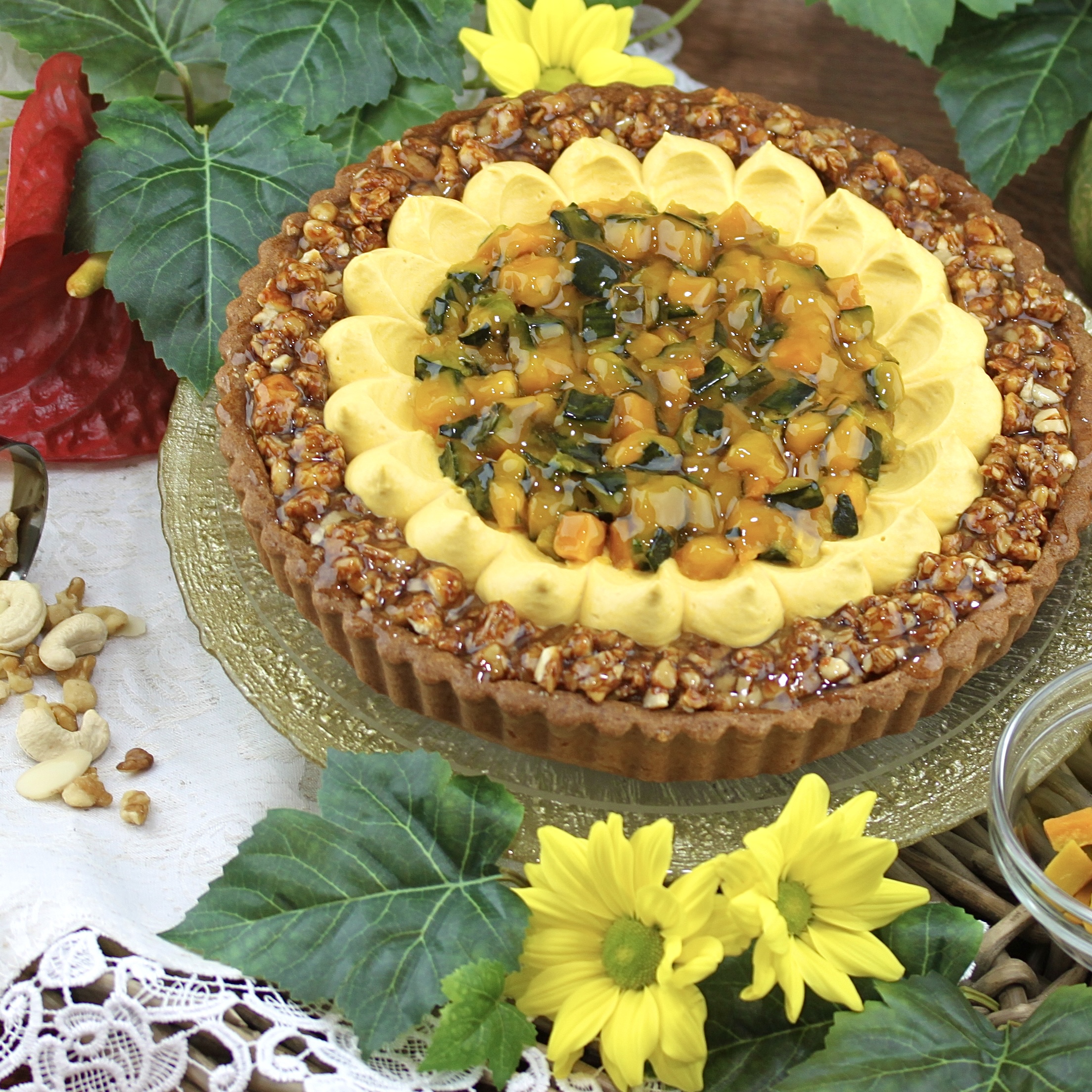 タルトの縁に飾りつけているキャラメリゼしたナッツとキャラメルソースの苦味がアクセントになった、かぼちゃ好きの方にはたまらないタルトです。