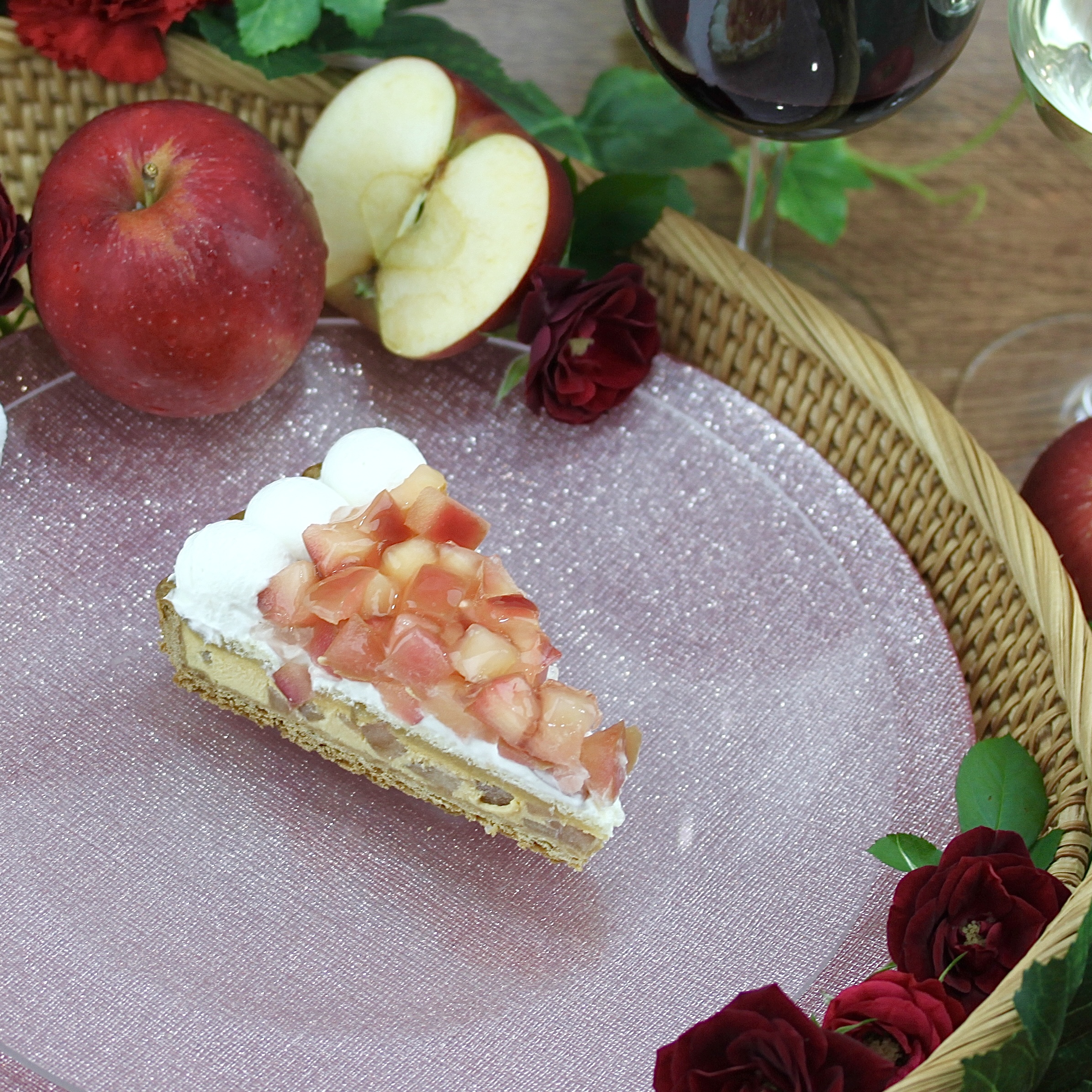 土台に混ぜ込んだりんごは赤ワイン煮、上に飾りつけたりんごは白ワイン煮で香る程度に仕上げています。