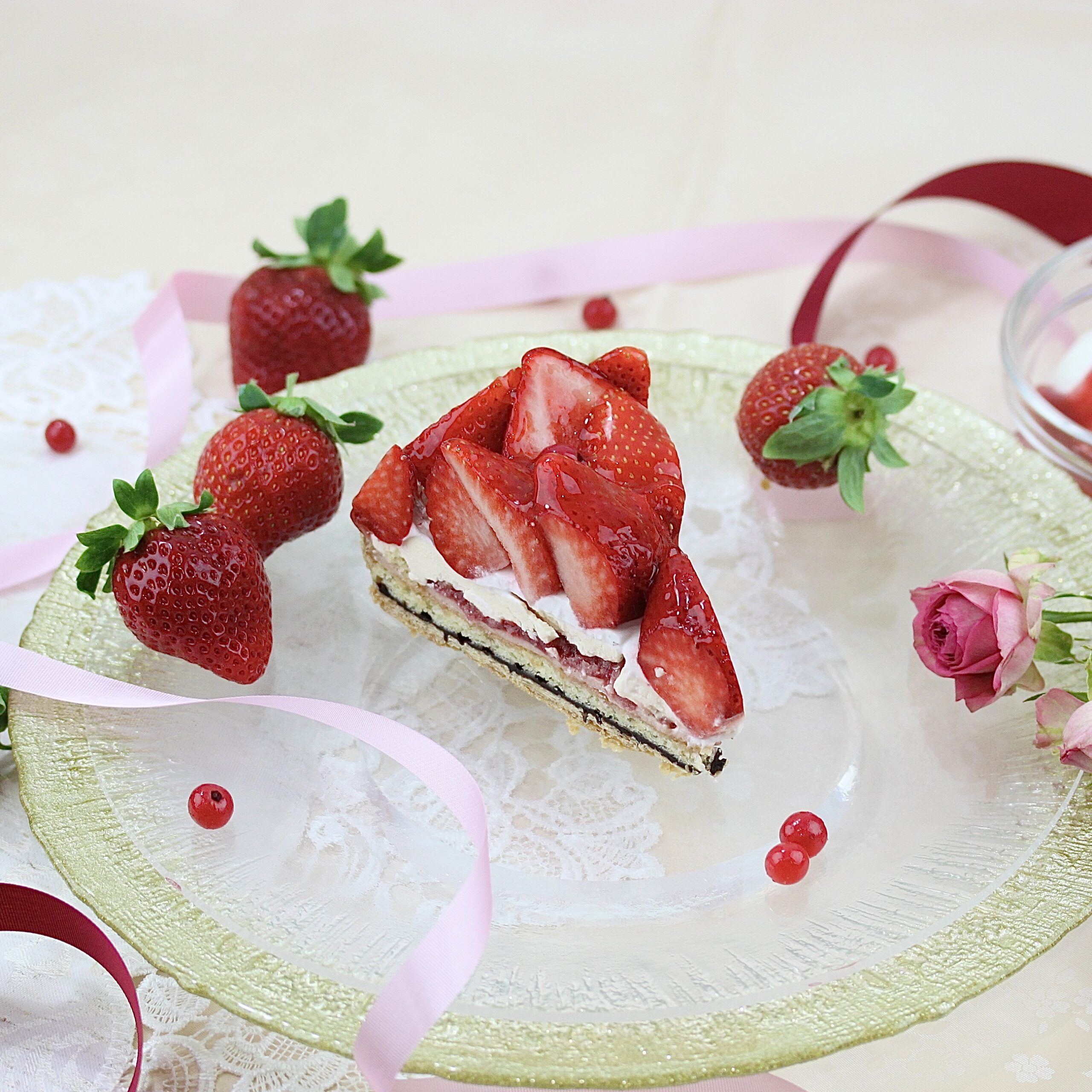 パイ生地に、ガナッシュ、ジョコンド生地、ババロア、いちごラズベリーソース、バタークリーム、いちごクリームの層の上にあまおういちごと酸味のあるグロゼイユを飾り付けております。